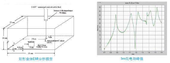 这是一个典型的EMC/EMI分析模型。屏蔽箱体为完全导电体,由特性阻抗为50欧姆的同轴线馈电,馈线终端加载47欧姆的电阻,箱体侧面开了一个细缝和一个孔。SEMCAD计算了带宽从400MHz到2.1GHz的宽带响应,仿真结果与公开的测量结果一致。