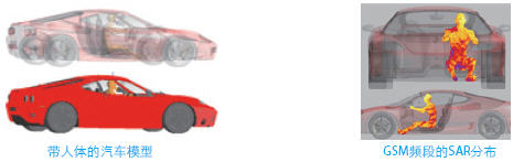 在汽车不同位置分别放置GSM天线,蓝牙和单极天线,分析整个汽车的近场分布,人体的SAR分布和S参数。由于天线的存在,汽车成为电大尺寸模型,采用SEMCAD的硬件加速技术,可在合理时间内轻松解决。