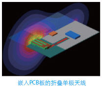 2 折叠单极天线由带状线构成,安置在PCB板上,用50欧姆的带状线馈电,一个3单元的T形匹配网络用来和天线输入端匹配。天线的带状线宽度用3-5个网格离散,介质基片厚度剖分成5个网格。远场结果类似标准单极天线。