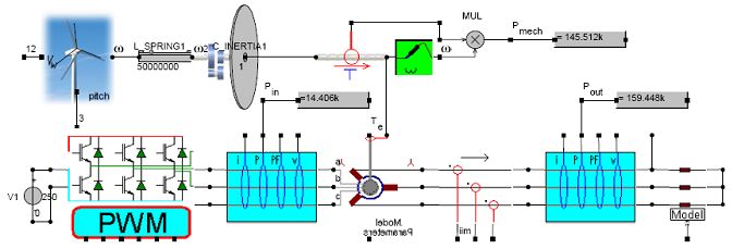 风轮机经刚性轴和齿轮箱连接到DFIG(双馈感应发电机)。发电机转子通过逆变器取电。DFIG发出的电力被输入主电网。