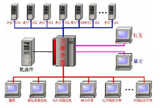 雷达对抗和红外对抗是一个建立在局域网上的软件系统,构建这个系统的每一台电脑完成整个工作中的一个环节。通过局域网传递信息,最终实现战场实时模拟推演。