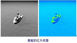 图示为一艘舰船的表面温度计算和红外成像。舰船的红外热源主要是太阳辐射以及舰船的烟道。在这两个热源的作用下,可以计算出舰船表面温度分布,进而得到该舰船的红外成像灰度图和彩色图,如图所示。