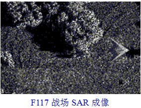 使用矩量法,首先计算出10GHz下F117雷达波照射下的散射回波,然后加载战场环境,得到F117和背景的SAR成像。