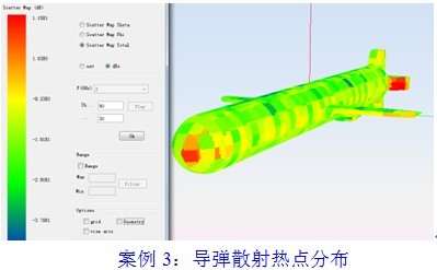 <案例3>模型与案例2相同,计算出在10GHz下,导弹上的散射热点分布和相应的模型表面电流分布: