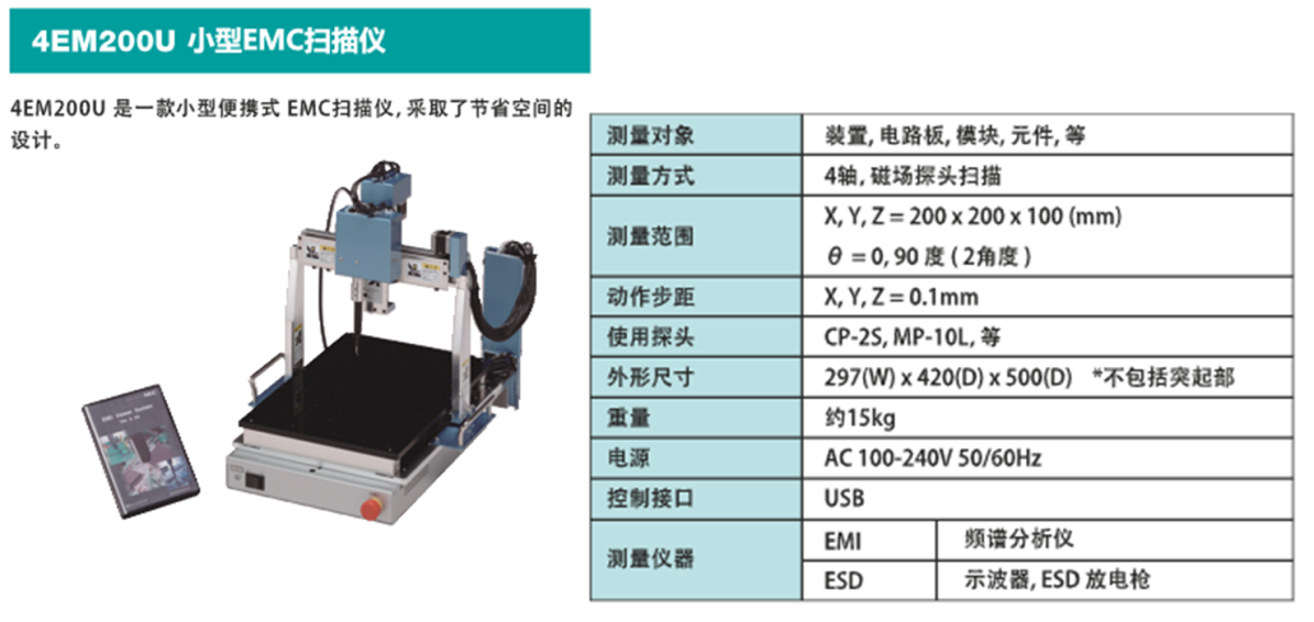 表面扫描的磁场探头扫描法(Magnetic probe method:MP法)是NEC公司最早开发出的检查方法。NEC公司把自己开发的MP法提案中所使用的磁场探头的技术规范提交IEC组织,经IEC组织标准修订程序审核,正式形成 IEC 的国际标准IEC61967-6。NEC公司的2款EMC扫描仪(4EM200/4EM500)符合国际标准。此外,NEC公司可以根据客户需要提供测量范围在 9kHz-18GHz的磁场探头。 (1)小型EMC扫描仪 4EM200